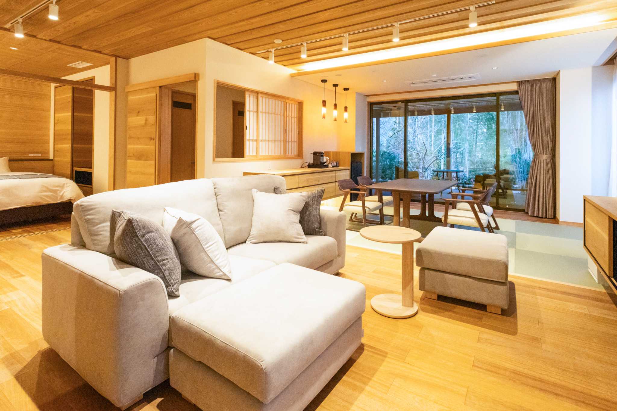 狩野川のほとり月ヶ瀬温泉の一軒宿。全室に源泉掛流し 露天風呂をご用意。リバービュー 、ガーデンビュー 、離れ、お好きなタイプをお選び下さい。 お食事は狩野川を目の前にした開放的なダイニングにて創作会席をご提供させていただきます。 ※小学生以下のお子様のご宿泊はご遠慮させていただいております。