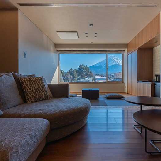 富士山の見える温泉旅館は、客室や大浴場から富士山をご覧いただける約50室の温泉旅館です。1Fロビーラウンジにあるワインサーバーで山梨県産ワインを気ままに楽しんだり、ショップではめずらしい山梨県産のプロダクトをご購入いただけます。お食事にもこだわり、夕・朝食には県産食材を多数使ったお料理が並びます